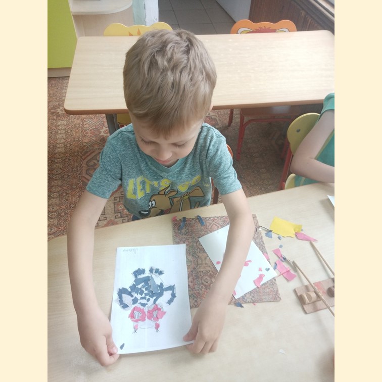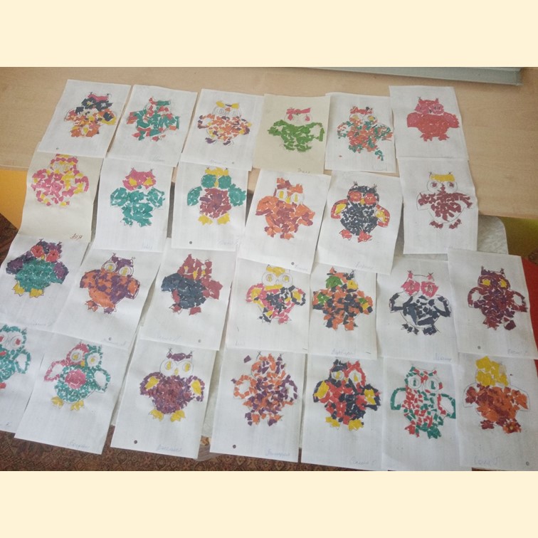 Творчество – важная составляющая становления личности любого ребенка. 25 июля ребята группы №12 «Лучики» увлеклись обрывной аппликацией – создание картины с помощью рваных кусочков цветной бумаги. В процессе такой аппликации задействована вся мускульная часть кисти, что, несомненно, развивает мелкую моторику. В результате кропотливой работы у дошколят получились удивительные совушки.