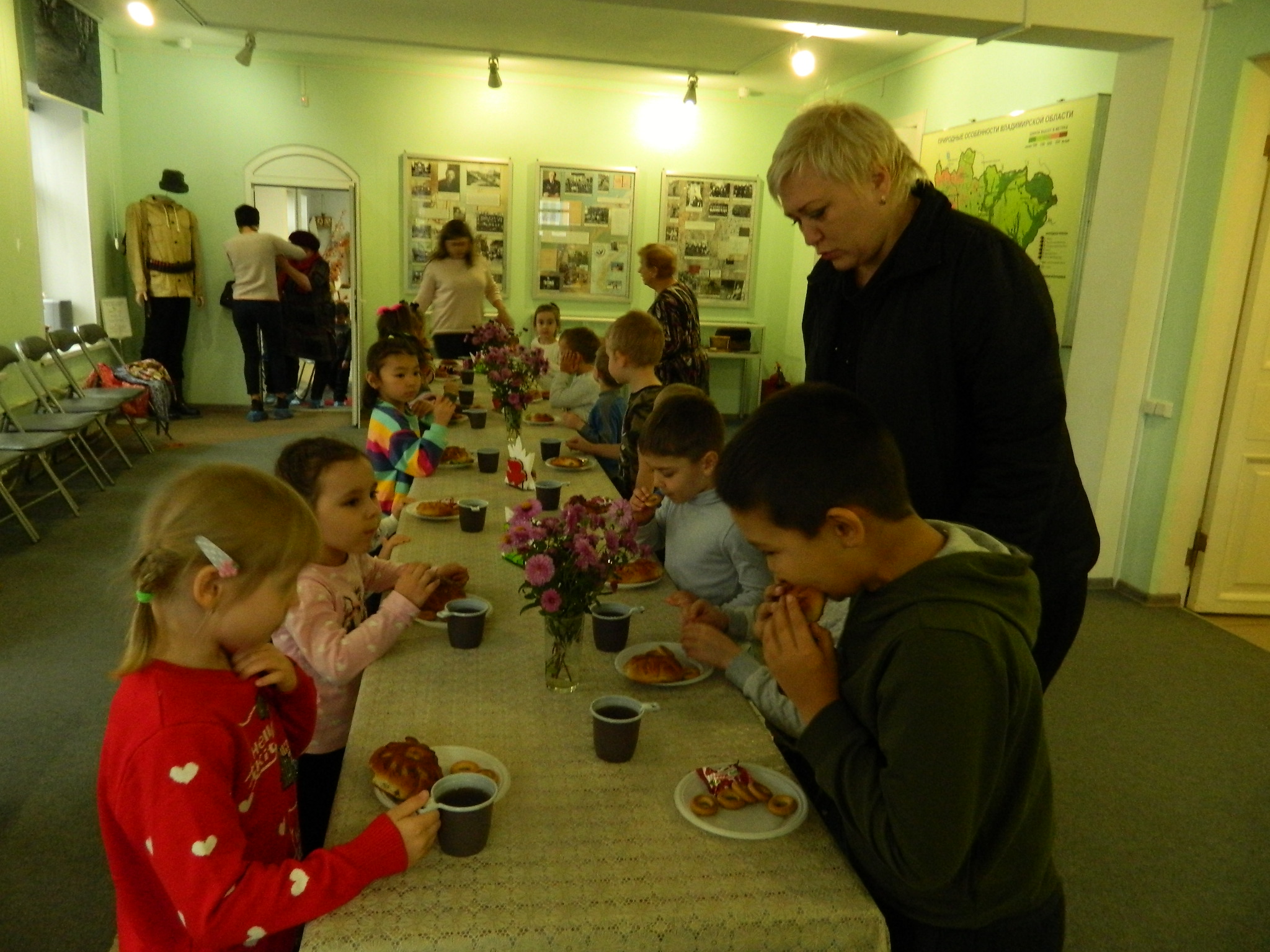 Ребята оказались не только хорошими слушателями, но и отличными помощниками. Помогли хозяйке дрова в поленницу сложить, да и водицы принести, научились плести пояс, рубить капусту. В конце, как и полагается, по доброй русской традиции гостей угостили вкусным ароматным чаем и сладкими пирогами.